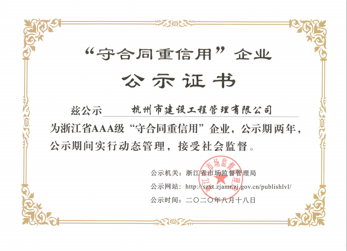 彩神(中国)建设工程管理有限公司荣获2020年浙江省AAA级“守合同重信用”公示证书,不仅证实了杭建“不信不立,不诚不行”一诺千金的企业行为,而且证明了杭建人在砥砺前行的道路上工作井然有序与有条不紊,我们将坚持以严谨的工作态度、实事求是、科学公正的立场,致力于招标代理和造价咨询事业。公司全体员工衷心感谢广大新老客户对公司发展的支持和帮助!